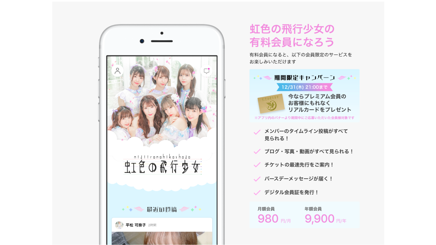 本アプリは、 アプリ一つで虹色の飛行少女の最新情報を完全網羅することが可能です。さらにプレミアム会員登録をして頂くとデジタル会員証の発行やライブチケットの先行予約などができる他、さまざまな動画・ブログ・タイムラインの更新をスマートフォンから確認できるアプリになっています。